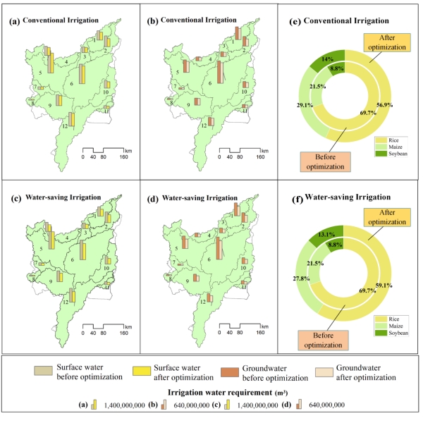 圖3 水資源優(yōu)化結(jié)果:(a) 優(yōu)化前后常規(guī)灌溉模式下地表水配置;(b) 優(yōu)化前后常規(guī)灌溉模式下地下水配置;(c) 優(yōu)化前后節(jié)水灌溉模式下地表水配置;(d) 優(yōu)化前后節(jié)水灌溉模式下地下水配置;(e) 優(yōu)化前后常規(guī)灌溉模式下作物灌溉用水分配比例;(f) 優(yōu)化前后節(jié)水灌溉模式下作物灌溉用水分配比例?