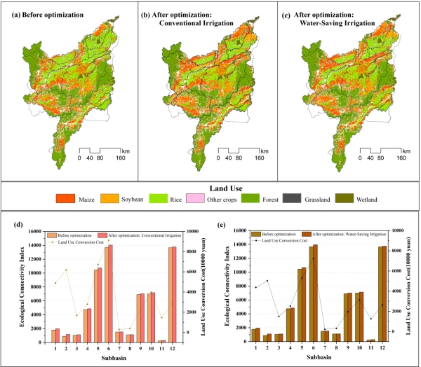 圖5 空間優(yōu)化配置結(jié)果:(a)優(yōu)化前土地利用類型分布;(b)常規(guī)灌溉模式下優(yōu)化后土地利用類型分布;(c)節(jié)水灌溉模式下優(yōu)化后土地利用類型分布;(d)優(yōu)化前后常規(guī)灌溉模式下生態(tài)系統(tǒng)連通性及轉(zhuǎn)換成本變化;(e)優(yōu)化前后節(jié)水灌溉模式下生態(tài)系統(tǒng)連通性及轉(zhuǎn)換成本變化。
